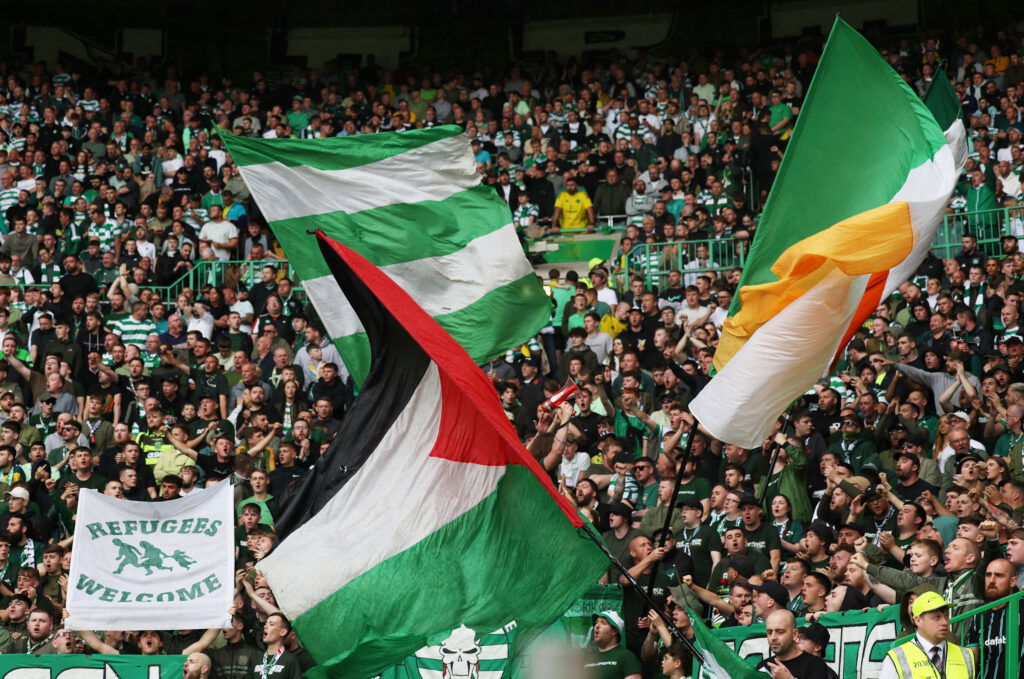 Soccer Football – Scottish Premiership – Celtic v Kilmarnock – Celtic Park, Glasgow, Scotland, Britain – August 4, 2024 Celtic fans display a Palestine flag Action Images via Reuters/Lee Smith