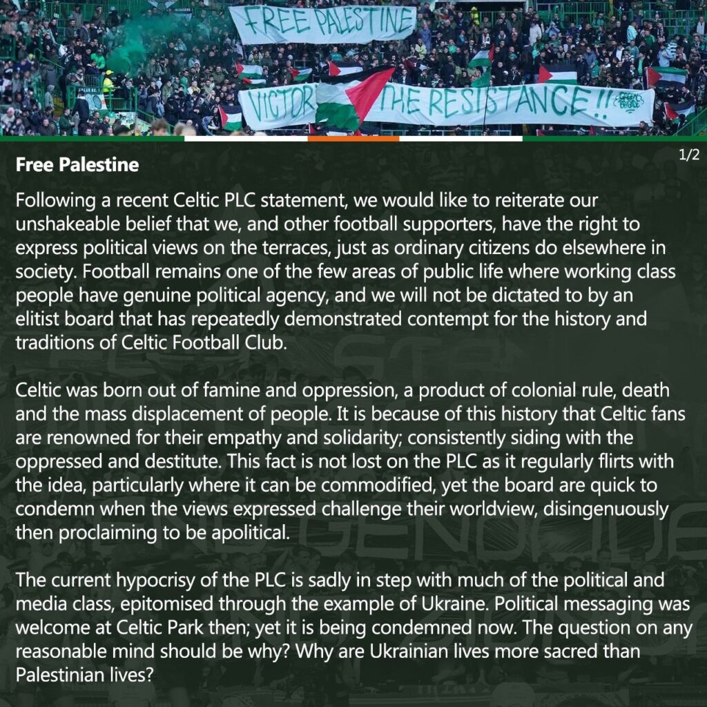 They talk about ‘match the fine for Palestine’ where the Green Brigade amassed an incredible amount of money in the face of a fine from UEFA over the waving of the Palestine flag during a game against Israeli opposition.