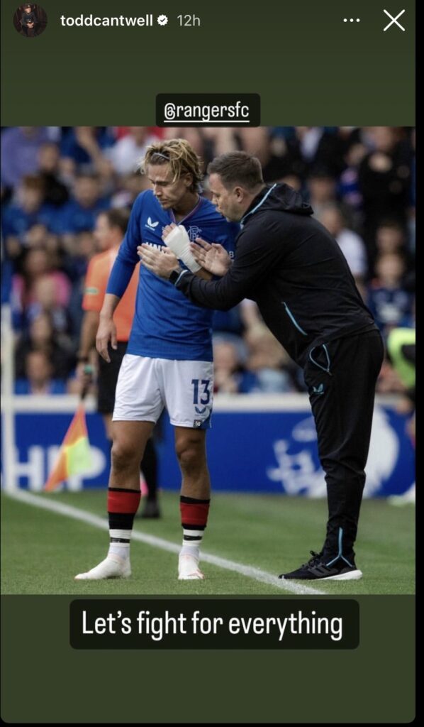 There he was, standing shoulder to shoulder with his boss Michael Beale, sending out a war cry through his Instagram story – “let’s fight for everything.” Fair enough. Fight on, brave warrior. But then, subtly enough to elicit a chuckle, there was the number 56 hovering on his shorts, suggesting the title will waltz over to Ibrox. That’s the spirit, Todd. Dream big.